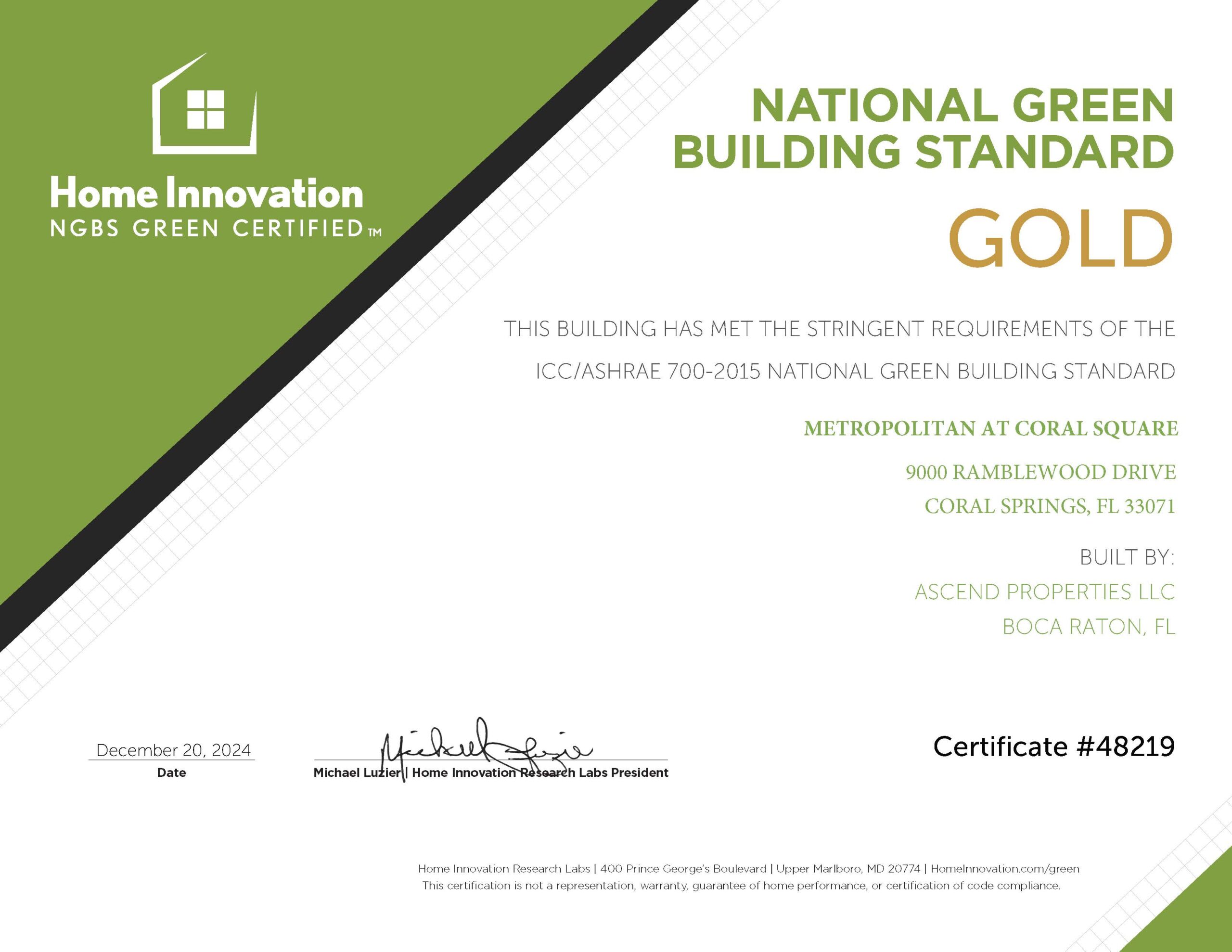 Metropolitan Coral Springs Achieves Prestigious ICC-700 National Green Building Standard Gold Certification We are thrilled to announce that Metropolitan Coral Springs, a premier luxury apartment complex in the heart of Coral Springs, Florida, has been awarded the prestigious ICC-700 National Green Building Standard (NGBS) Gold Certification. This esteemed recognition is